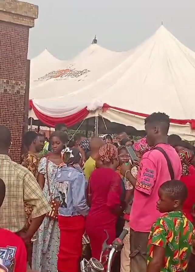 A crowd of people, including adults and children, has gathered outside. The people are dressed in a variety of colorful outfits, many with red clothing. A large white tent with red and white fabric draped at the entrance is visible behind them. A motorcycle is parked in front of the crowd, and several buildings can be seen in the background. Wires are strung overhead. The crowd appears to be interacting with each other, with some people looking at their phones and others talking.