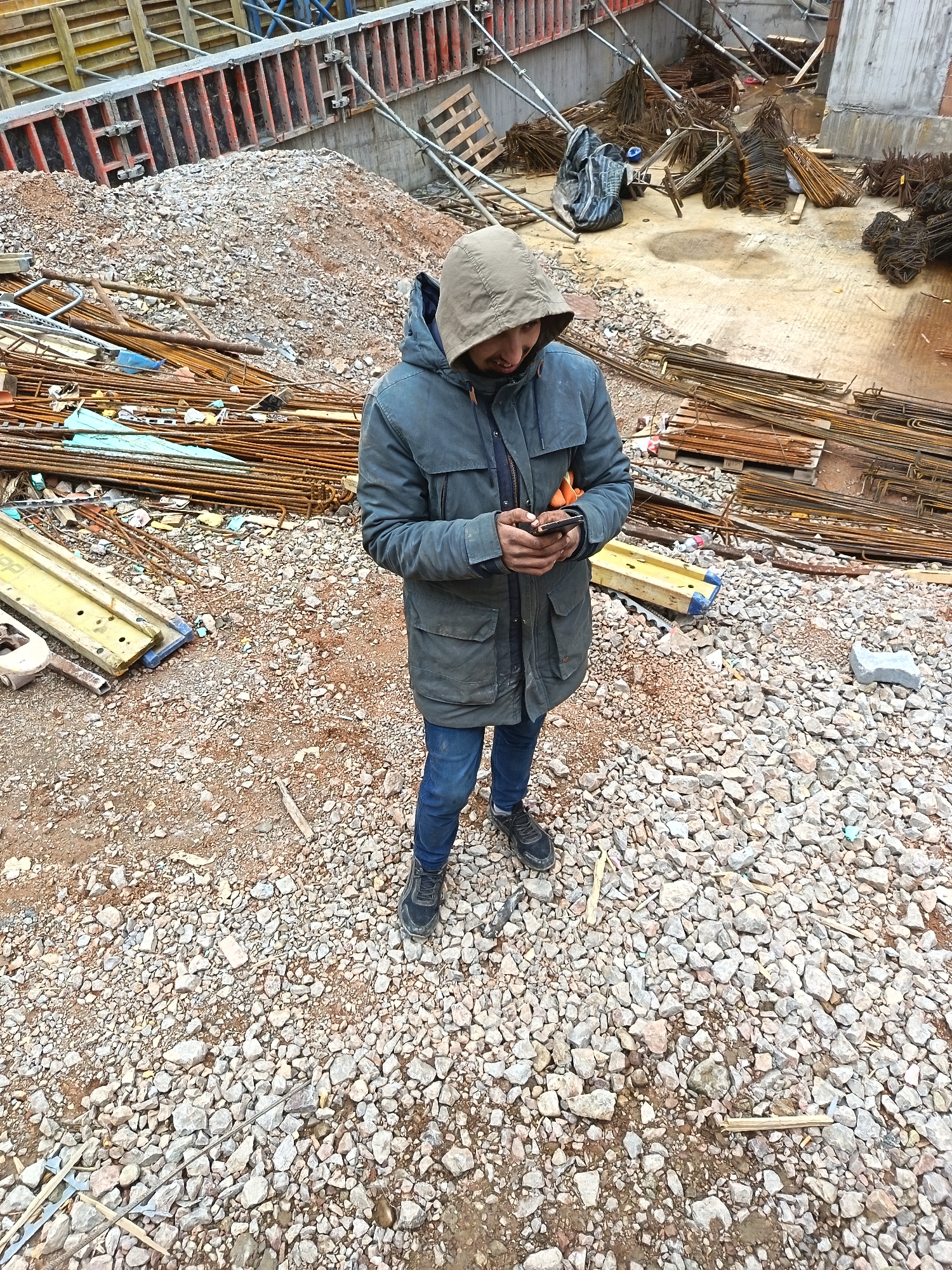 person standing on a construction site. The person is wearing a blue jacket with a hood, blue jeans, and black shoes. They are looking at a mobile phone in their hands. The ground is covered with gravel and scattered construction materials, including rusty rebar, wooden planks, and metal supports. In the background, there are more piles of rebar, construction scaffolding, and concrete structures. The location is likely a construction site within an urban area, given the presence of building elements, but specific landmarks to definitively identify Sofia, Bulgaria, are not visible.
