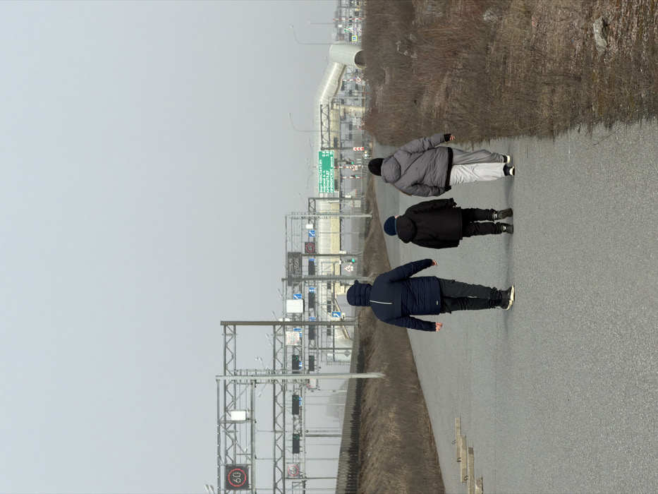 Three individuals, viewed from behind, walk abreast on a grey asphalt path extending into the distance under an overcast sky. From left to right: an adult male in a dark blue hooded puffer jacket, dark pants, and light-soled sneakers; a child in a dark hooded jacket, dark pants, and a dark beanie; and an adult, possibly female, in a grey hooded puffer jacket, light-colored trousers, and dark sneakers. To the right of the path is a strip of dry, brown vegetation and scattered rocks. To the left of the path, several concrete blocks are present. In the background, a complex network of grey metal overhead gantries spans across a multi-lane highway, supporting numerous traffic signs and electronic displays. Several circular speed limit signs displaying "60" are visible. A prominent green highway sign on the right side of the infrastructure indicates directions to "Кронштадт" (Kronstadt), "о. Константин" (Konstantin Island), and "Приморское шоссе" (Primorskoye Highway), with associated distances. A large, curving silver/grey cylindrical structure, possibly a ventilation tube or tunnel entrance, is visible on the far right. A dark barrier or fence separates the path from the main highway infrastructure. The scene is located near Kronstadt, Russia, specifically along the highway connecting to the city.