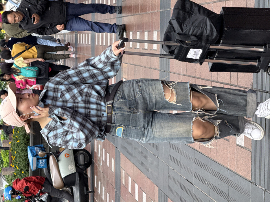 - "A person in ripped jeans, a plaid shirt, and a pink baseball cap stands on a patterned sidewalk, pulling a black suitcase" by FM-K0Kp62, licensed under CC BY 4.0