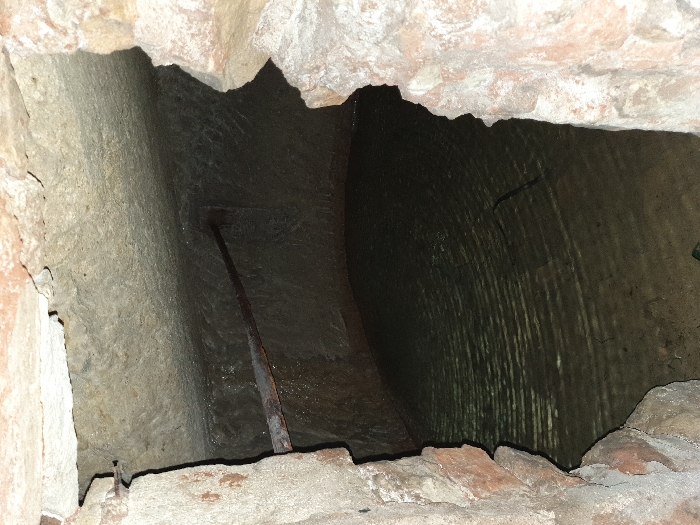 view from above, looking down into a deep, circular shaft. The shaft is lined with rough, uneven stonework. A large metal pipe runs diagonally down the right side of the shaft. The bottom of the shaft is obscured by darkness. It is unknown what purpose the shaft serves. It is impossible to determine the location of the image, as the provided coordinates are not on Earth.