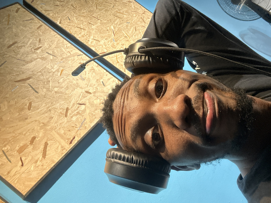 A selfie shot from a low angle depicts a dark-skinned individual, appearing male, centered in the frame. He has short, curly black hair and a neatly trimmed short beard and mustache. His facial expression includes wide-open eyes, raised eyebrows causing visible forehead wrinkles, and pursed lips. He wears a black long-sleeved shirt. Black over-ear headphones are positioned with the earcups resting on his head just above his ears; the right earcup (viewer's left) has a flexible microphone boom arm extending upwards. The background is divided: the lower portion on the left and right sides consists of a solid light blue wall. The upper portion features an angled ceiling or wall panel constructed from Oriented Strand Board (OSB), characterized by its coarse wood flake composition, framed by dark beams. Faint reddish-brown markings are visible on the OSB surface. A partially visible metallic fan grille is present in the lower right background, indicating a standing fan. The specific location within Abuja, Nigeria, cannot be identified from the visual information provided in the image.