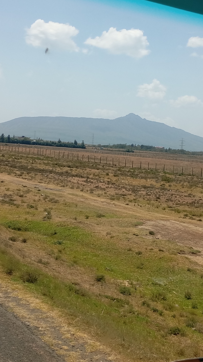 The image displays an expansive outdoor landscape within Hells Gate ward, Kenya, under a light blue sky with scattered white cumulus clouds. A dark, amorphous smudge is present in the upper left sky. A distant, hazy grey-blue mountain range with a prominent peak forms the horizon. The midground features a large, mostly dry field dominated by yellowish-brown grass and sparse green vegetation. A long, dark-colored fence line, composed of regularly spaced vertical posts without visible wire, extends horizontally across this field. Beyond the fence, a line of dark green trees, a few indistinct structures, and at least two high-voltage power line towers are visible. The immediate foreground shows a gently sloping area covered with a mix of dry brown and green grasses, with a dark, unpaved surface visible at the bottom left corner, likely the edge of a road. No people or animals are discernible.