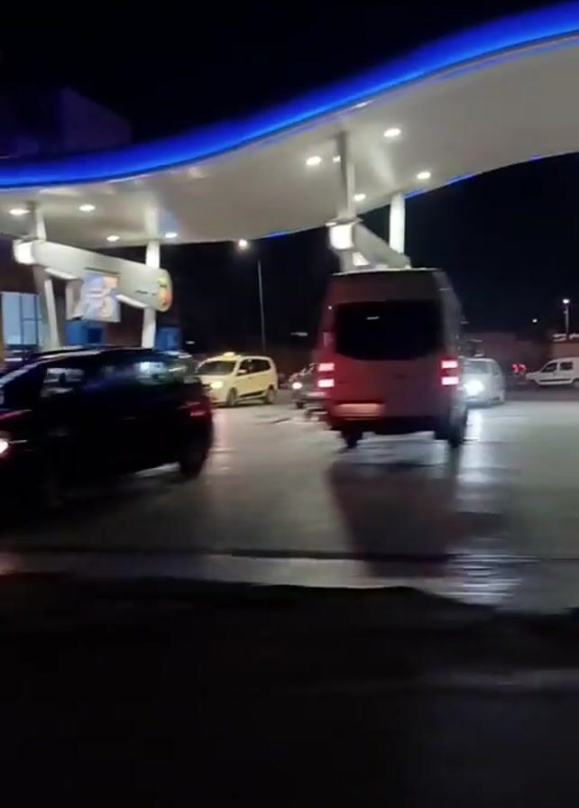 The video depicts a nighttime scene at a gas station and on a road. Initially, two white vans are visible under the brightly lit canopy of a gas station, with other vehicles in the background. The camera then pans rapidly, capturing multiple cars and a taxi at the gas station. The scene transitions to a view from a moving vehicle on a well-lit road at night. Other cars, motorcycles, and streetlights are visible. Trees line the sides of the road.