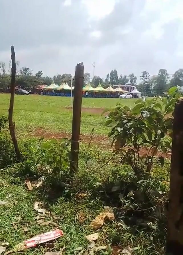 field with several tents set up, likely for an event. The view is partially obstructed by a wooden fence and some vegetation in the foreground. The tents appear to be arranged in a row, with tables and chairs visible underneath. There are a few cars parked nearby. The sky is overcast. There is litter visible on the ground in the foreground. Someone speaks in the background.