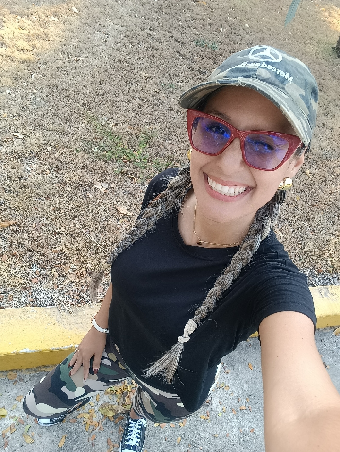A woman in a camouflage hat with the Mercedes logo, large red-framed glasses, and gold earrings smiles brightly. She wears a black t-shirt, camouflage pants, and black sneakers. Her hair is styled in two braids tied with light-colored bands. A gold necklace adorns her neck, and a white bracelet is visible on her wrist. The background includes dry grass and concrete, with a yellow curb visible near her feet.