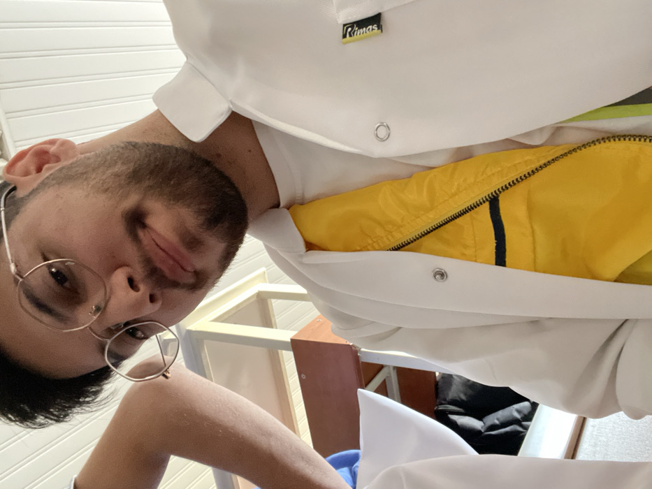 A close-up, low-angle image depicts a young adult male in قرية الضبية, Syria, engaged in a self-portrait. He has a light skin tone, dark hair, and a short beard and mustache. He is wearing round, gold-rimmed eyeglasses. The male is dressed in a white professional coat or lab coat with the lapels open, revealing a bright yellow garment or lining underneath, which is partially zipped. A white round-neck undershirt is visible beneath the yellow layer. A black and yellow tag with the word "Rimas" is affixed to the right chest area of the white coat. Metal snap fasteners are visible on the coat's front opening. His expression is neutral to slightly smiling. To the left, a portion of another individual's arm, also in a white sleeve, is visible. The background indicates an indoor setting, likely a classroom or laboratory, with light-colored shelving or furniture, and a white paneled ceiling. A dark object, possibly a bag, is partially visible beneath the furniture in the background.