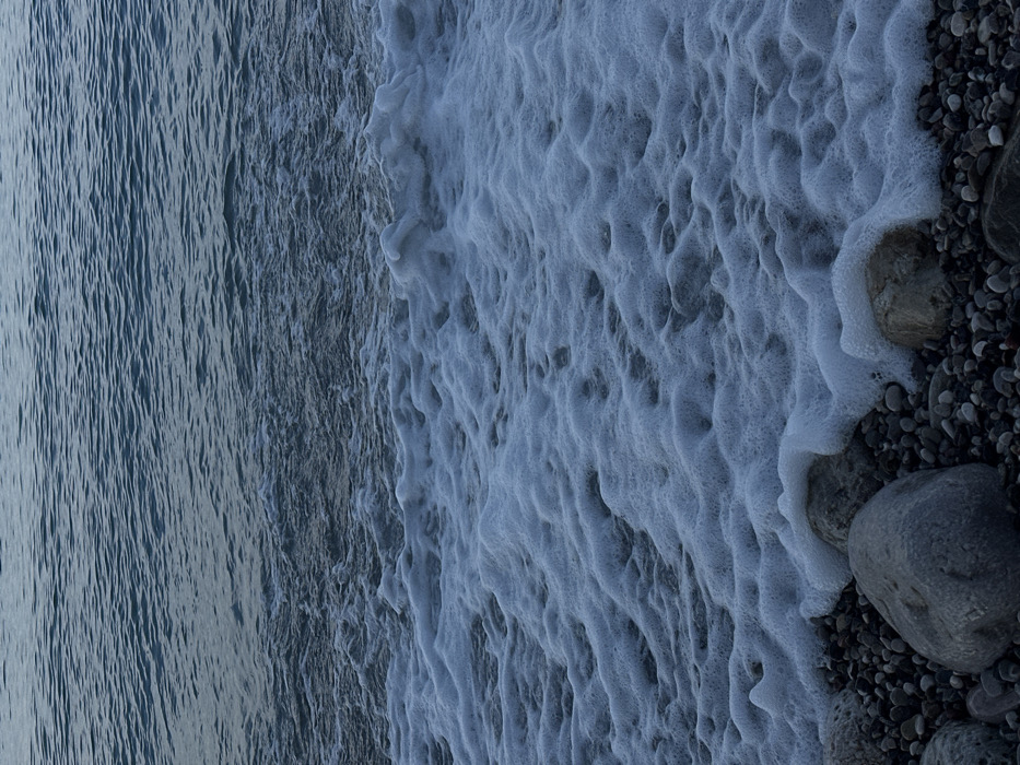The image displays a detailed, low-angle view of a rocky and pebbled shoreline, consistent with a beach in Šušanj, Montenegro. The upper two-thirds of the frame consists of the sea, characterized by dark blue-gray water with visible ripples and small waves. Directly below this, a wide band of white, frothy foam extends across the width of the image, signifying breaking surf or residual foam from receding waves. The lower third of the image shows the immediate shoreline, composed of numerous small, dark gray to black pebbles. Interspersed among these pebbles are several larger, irregularly shaped, light gray rocks. The white foam is actively in contact with and partially covers these rocks and pebbles, indicating the precise water's edge. No individuals, structures, or artificial objects are present. The lighting is diffused, resulting in a cool, muted color palette.