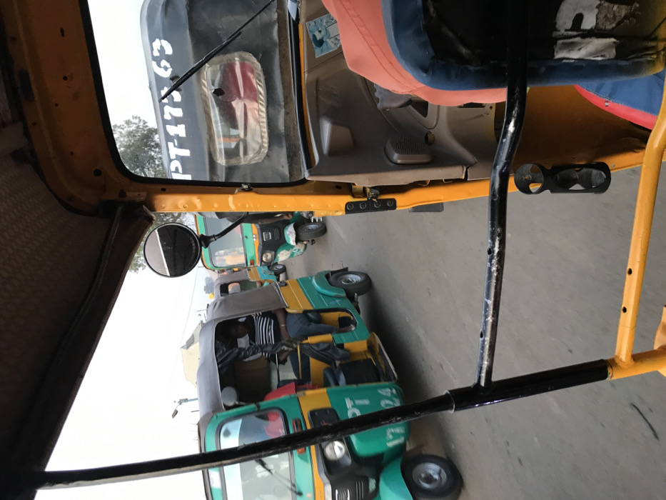 The image displays a street scene in Rafin Par, Nigeria, captured from the interior perspective of a yellow tricycle