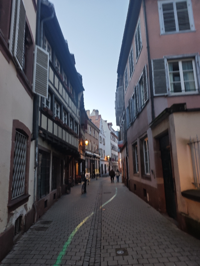 A narrow cobblestone street lined with European buildings rises towards the horizon. The structures display half-timbered designs and shuttered windows. A green and yellow line curves along the left side of the street. People walk in the distance, and a bicycle rests on the left. The sky is a light blue hue, suggesting dusk or dawn. The scene evokes a historic, walkable European neighborhood.