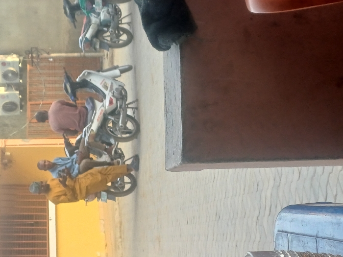 A trio of individuals occupies a motorcycle on a street scene. The man at the rear is clad in a yellow robe and turban, while the middle individual wears a blue shirt. A third person sits on another motorcycle. A building with air conditioning units is visible in the background, with parked scooters adding to the urban setting. Part of a table is in the foreground.