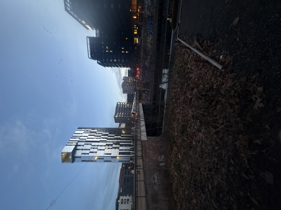 An urban landscape displays modern architecture alongside a river. Tall buildings of varying heights and styles dominate the skyline, one with a unique geometric facade. A waterway runs through the scene, reflecting some of the city lights. The foreground features fallen leaves, suggesting a seasonal transition. The sky is partially cloudy, indicating twilight. A pedestrian area runs alongside the river.