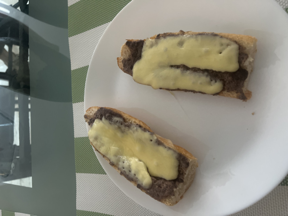 - "The image depicts two slices of baguette, each topped with a dark, purplish-brown spread, likely refried beans, and melted pale yellow cheese" by FM-0LhgI3, licensed under CC BY 4.0