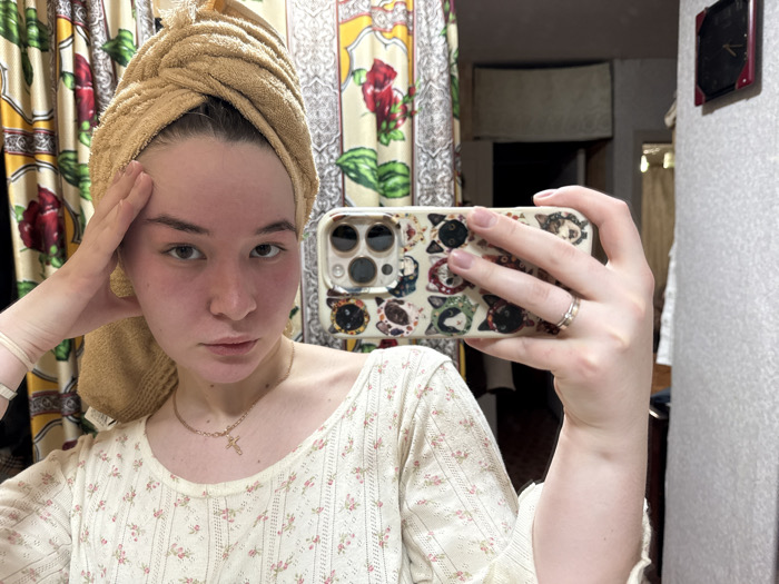 A person, presumably female, takes a selfie in a bathroom-like setting