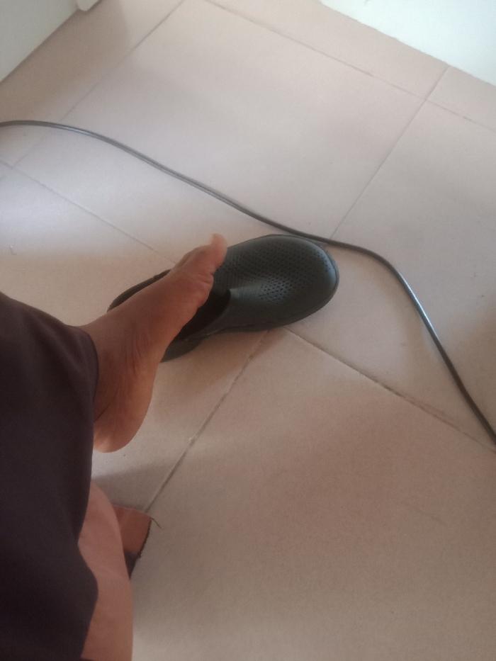 The image depicts an indoor scene in Gandu Albasa, Nigeria. A bare human right foot, light brown in skin tone, is shown partially inserted into a dark-colored, possibly black, perforated slipper or clog. The foot is positioned from the lower left towards the center-right. A dark, thin electrical cord runs diagonally across the beige-tiled floor, passing behind the slipper and extending out of frame at the top left and bottom right. The floor consists of light-colored square tiles with visible grout lines. A plain white wall is visible in the upper right background.