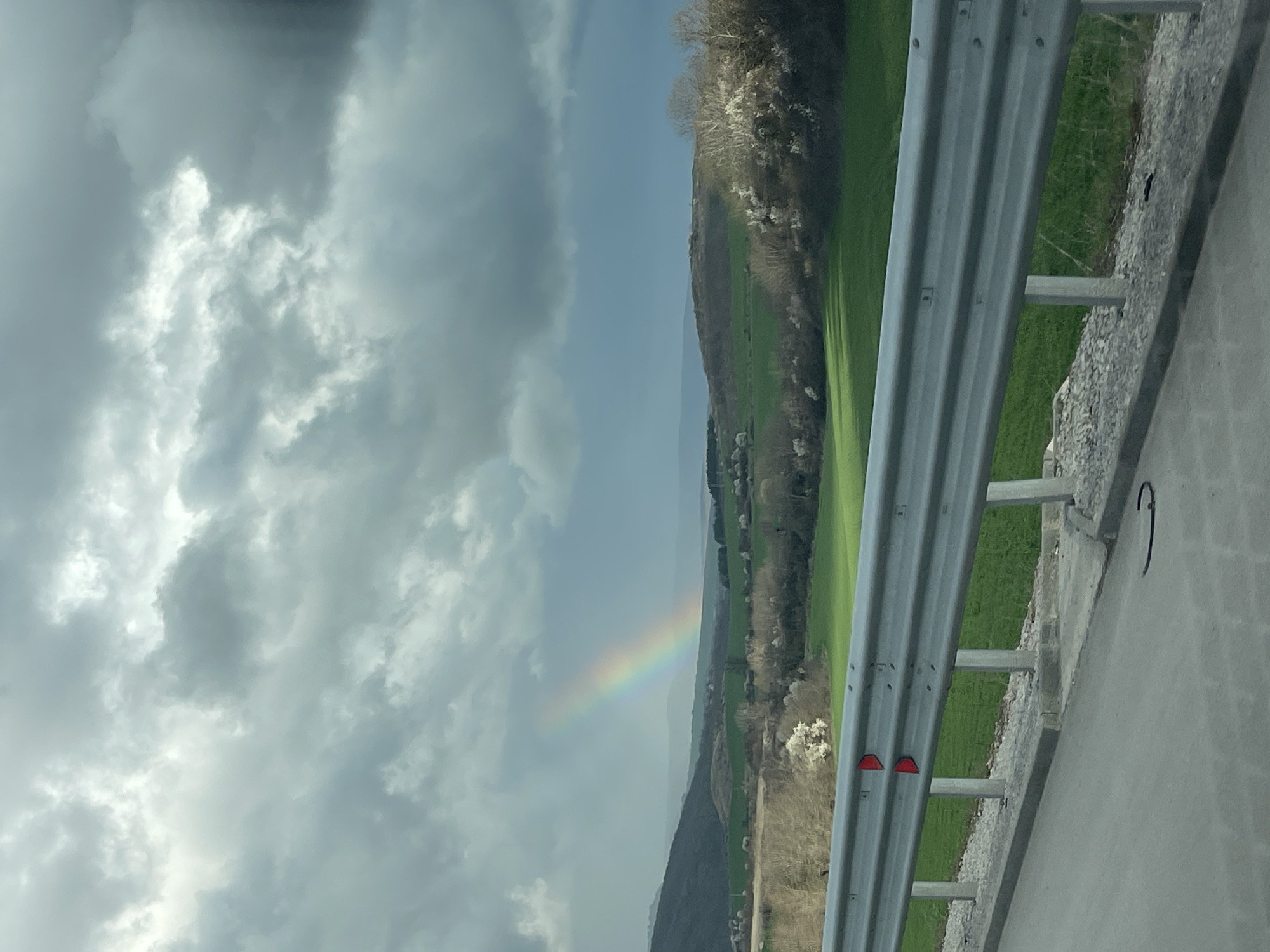 The image depicts a rural landscape under a cloudy sky with a partial rainbow visible. A metal guardrail runs along the right side of the frame, alongside a concrete road surface. Beyond the guardrail is a green field or hillside, with trees and a few buildings scattered in the distance. The photograph was taken in the city of Buhovtsi, Bulgaria.