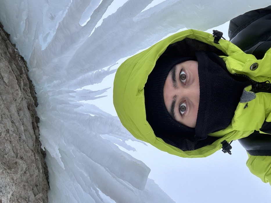 - "An upward-angled, close-up photograph depicts an individual beneath a formation of numerous white and translucent ice stalactites, located in Bolgar, Russia" by FM-iCO5W2, licensed under CC BY 4.0