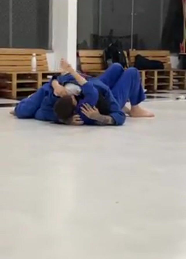 - "Two people wearing blue Jujutsu uniforms are grappling on a white mat in a well-lit room" by FM-iYMz92, licensed under CC BY 4.0