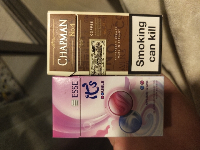 In Sơn Trà Ward, Vietnam, an indoor photograph at eye-level captures two distinct tobacco product packages held vertically by a hand, visible in the lower left. The package on the left is a pink and white 'ESSE it's DOUBLE' brand of 20 class A filter cigarettes, labeled 'APPLE MINT & WINE' and 'AMERICAN BLEND'. The package on the right is a brown and cream 'CHAPMAN No. 4' brand of superslim coffee cigars, explicitly stating 'MADE IN GERMANY' and bearing a prominent white health warning: 'Smoking can kill'. The background is out of focus, consisting of dark, mottled surfaces and a light-colored, soft fabric. No other individuals are visible.
