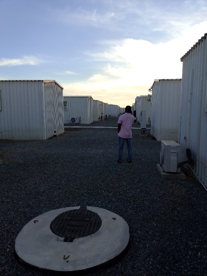 This image depicts an outdoor scene within a modular building complex, likely a temporary accommodation or labor camp, in Hanak, Saudi Arabia, observed during late afternoon or early evening