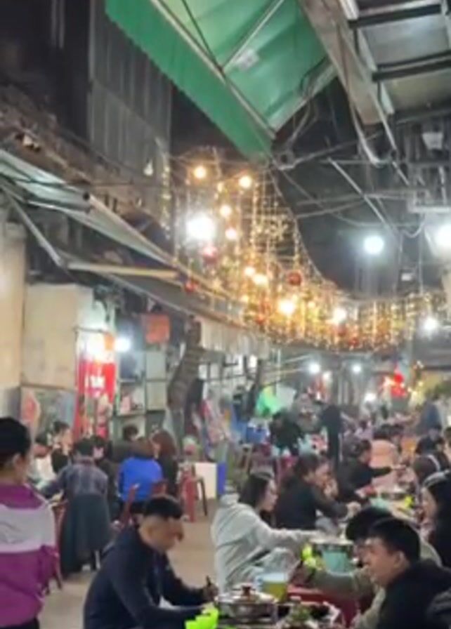 bustling outdoor restaurant scene, likely in a city. People are seated at red plastic tables and chairs, eating and socializing. String lights, some with red ornaments, hang overhead, illuminating the area. The architecture is urban, with awnings and wires crisscrossing above. People are dressed casually. The overall atmosphere suggests a vibrant and lively dining experience.