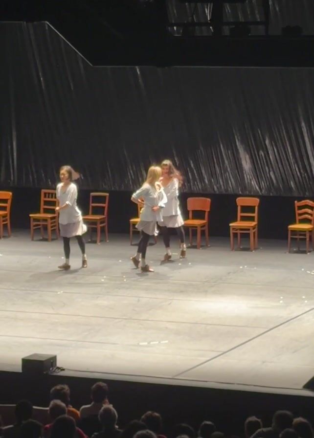 A stage is set with a gray floor, a black curtain backdrop, and six wooden chairs arranged in a line. Three young dancers, dressed in white tops and dark leggings, move around the stage, performing a modern dance routine. They briefly hug, then move independently, gesturing with their arms. In the foreground, an audience of people is seated, watching the performance.