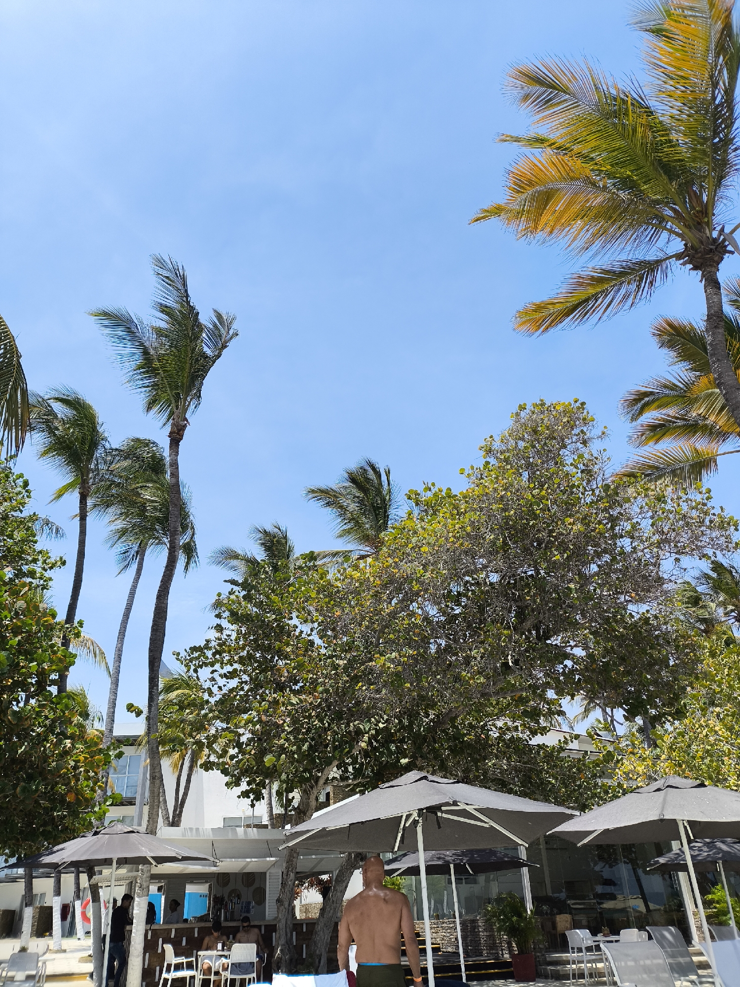 Captured in El Yaque, Venezuela, the scene is a tropical beach setting under a clear blue sky. Towering palm trees frame the upper portion of the image, their fronds swaying in the breeze. Below, the view opens to a beach bar area, partially shaded by several dark-colored umbrellas. People are seated at the bar, and a shirtless man wearing green shorts walks by in the foreground. The bar itself is white with dark accents, and the building behind it is a modern structure with windows. Beach chairs and tables are scattered around the bar area.
