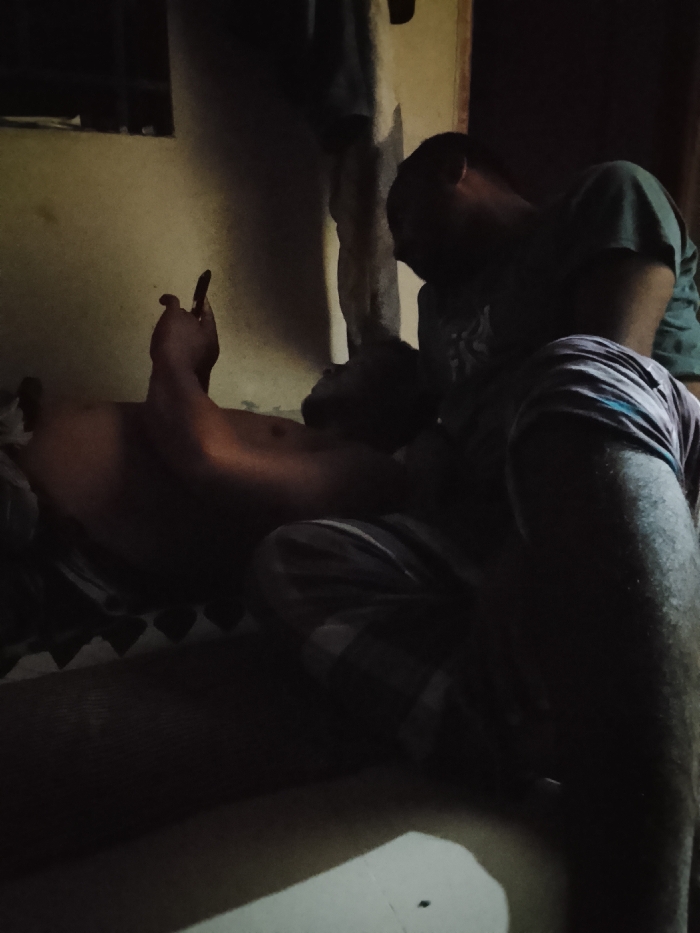 The image depicts an indoor scene in a dimly lit room, presumed to be within Dhaka, Bangladesh, though no specific geographical markers are discernible from the visual evidence. Two adult males are present. One male is positioned on the left side of the frame, lying on his back or side, bare-chested, with light skin, and wearing dark, possibly striped, lower garments. His left arm is raised, with fingers curled around a slender, dark object, consistent with a mobile phone. His head is partially visible towards the right, obscured by the second individual. A dark patterned fabric, possibly a mattress cover or blanket, is beneath him. The second male is in the foreground and center-right, seated with his back partially to the viewer. He wears a dark-colored, short-sleeved top and striped pajamas or loungewear. He is positioned leaning over or next to the first individual, with his right leg visible in the lower right foreground, showing dark leg hair. Both individuals' facial features are largely obscured by shadows. The room features plain, light-colored walls in the background, with prominent dark shadows. A dark fabric object hangs on the wall or a fixture in the upper background. The overall lighting is dim and warm-toned, suggesting a single, unseen light source. The floor or immediate surface beneath the individuals is dark and indistinct.