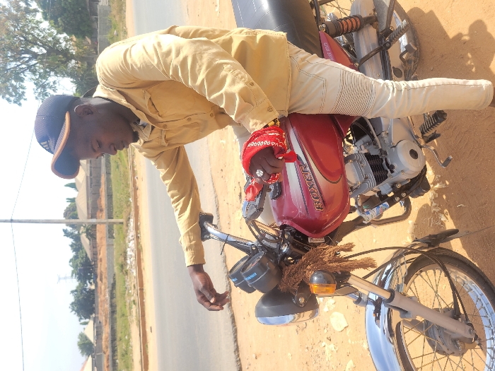 A young adult male is depicted seated on a red Bajaj Boxer motorcycle, positioned on a dirt ground next to a paved road in Suleja, Nigeria