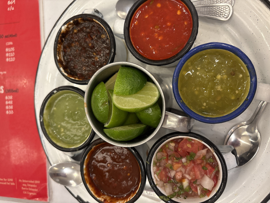 The overhead shot showcases a circular platter with various condiments. Six small bowls contain diverse sauces: a dark, chunky salsa; a bright red salsa; a light green, watery salsa; another green salsa; a dark red-brown sauce; and a fresh-looking salsa with chopped tomatoes and onions. A metal container in the center is filled with lime wedges. Silver spoons are positioned beside each condiment bowl, neatly arranged on the platter. A red menu with white text is partially visible on the left.