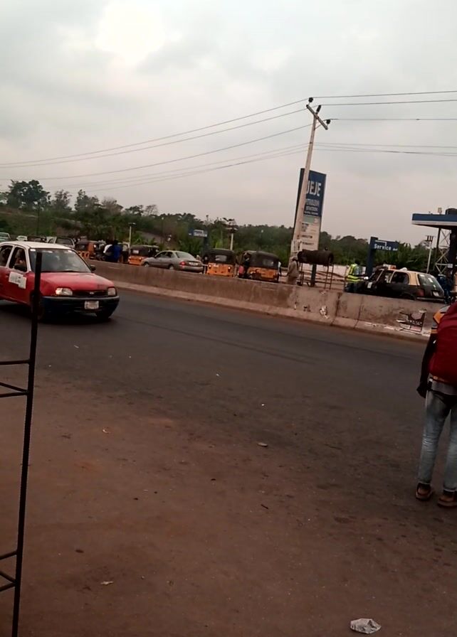 The scene unfolds on a busy road, with a prominent gas station visible on the far side. Cars and auto rickshaws queue up, while pedestrians mill about near the station. A red and white taxi drives by, followed by a black minivan. The sky is overcast. One pedestrian, with a red backpack, is shown closest to the camera. The scene appears to be a typical day at a bustling roadside gas station.