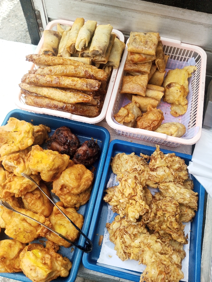 An overhead shot displays various Indonesian fritters arranged in trays and baskets