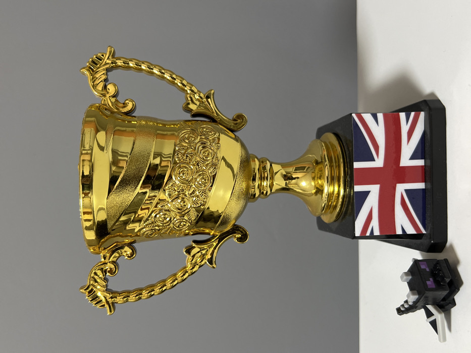 The scene, located in the city of Breznitsa, Bulgaria, displays three primary objects arranged on a flat, white surface against a uniform grey background. A prominent golden trophy, approximately 20-25 cm in height, occupies the central position. This trophy features a cup-shaped body with two ornate, curved handles, and its surface is decorated with horizontal textured bands and a central relief pattern of roses. It stands on a black, rectangular plinth. Attached to the front face of this plinth is a rectangular emblem depicting the United Kingdom's Union Jack flag. To the immediate left of the trophy's base, a small, blocky black figurine, identifiable as the Ender Dragon from the video game Minecraft, rests on the white surface, characterized by its purple eyes, gray horns, and white wing details. No individuals or active interactions are present in the static indoor environment.