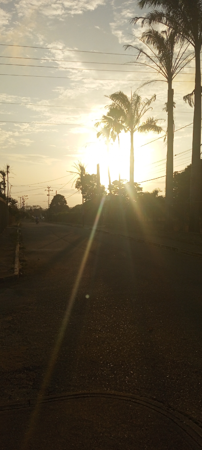 A street scene bathed in sunlight features palm trees silhouetted against a bright sky with scattered clouds