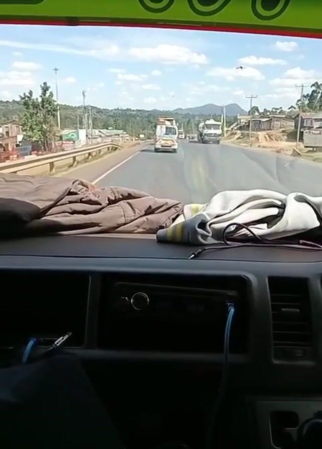 The view from inside a car looking out the windshield shows a two-lane road in a rural area