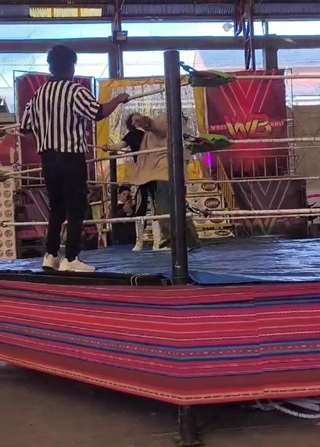 A referee in a black and white striped shirt and black pants watches as two wrestlers, one in a black shirt and the other in a brown coat and mask, wrestle in a wrestling ring. The wrestling ring has blue padding, and the edge is decorated with a colorful red, blue, and pink design. A banner with the word "WRESTLING" in red is behind the ring. The environment is an indoor arena with a high, corrugated metal ceiling and natural light coming through the windows.