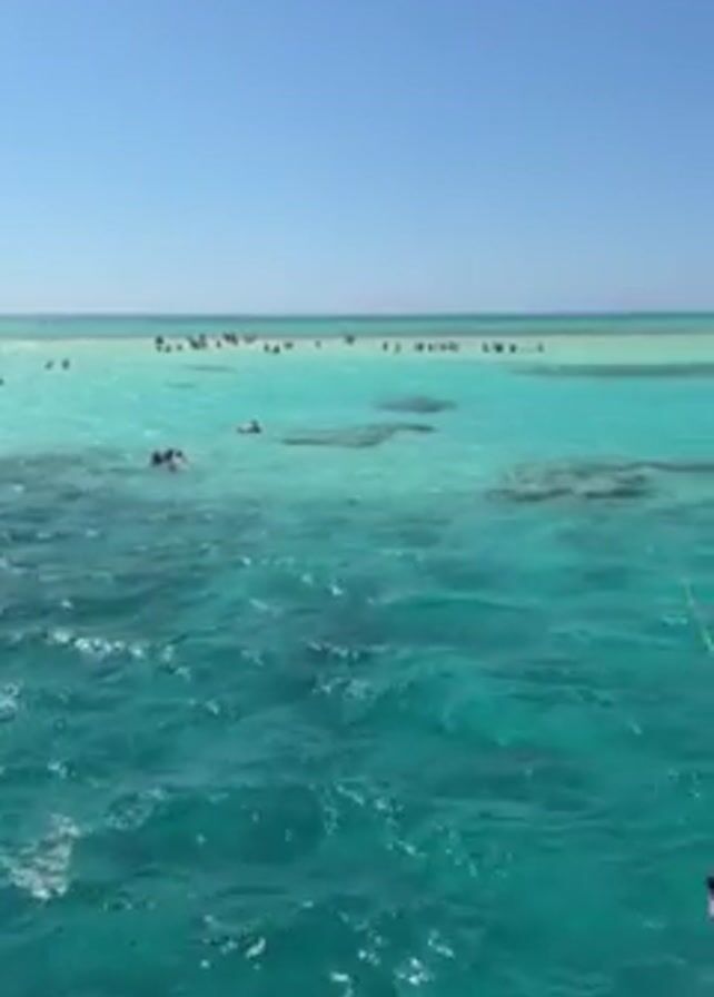 A wide shot of the ocean shows many people swimming in the bright turquoise water. They appear to be tied together with yellow ropes. In the distance, a small sandbar island is visible, with even more people standing on it. Several boats are also anchored nearby. The sky is clear and blue.