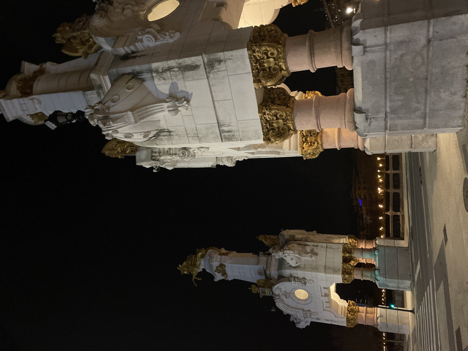A nocturnal view showcases the Peterskirche in Vienna, Austria. The baroque architecture is emphasized by the upward perspective, with intricate white and gold detailing under spotlights. The base columns, adorned with ornate faces, lead to the building's facade. The night sky provides a stark contrast, while nearby structures are dimly visible. A sidewalk is also apparent in the frame.