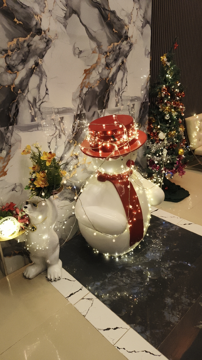 The scene depicts an indoor festive display, presumably within a hotel or commercial lobby in Pattaya City, Thailand. A large, white, stylized snowman figure occupies the mid-ground, adorned with a red hat and a red scarf. Multiple strands of small, glowing white string lights are wrapped around the snowman and its hat. To the snowman's right, a green artificial Christmas tree stands, decorated with various gold, red, and silver ornaments, tinsel, and illuminated by white and multi-colored string lights, topped with a red star. To the left of the snowman, a white ceramic dog statue, depicted wearing sunglasses and holding a glowing spherical object, is also illuminated by white string lights. Behind the dog statue, a vase containing yellow flowers and green foliage is visible. The immediate background features a tall wall clad in white and gray marble-patterned panels with distinct gold veining. The floor is composed of various tiles, including light-toned square tiles, polished black tiles reflecting the lights, and white tiles with prominent black veining. A dark, vertically paneled wall is partially visible behind the Christmas tree, and a section of a light-colored upholstered armchair is discernible in the upper right background. The area is illuminated by the numerous decorative lights, suggesting an evening or night setting. No individuals are present in the image.