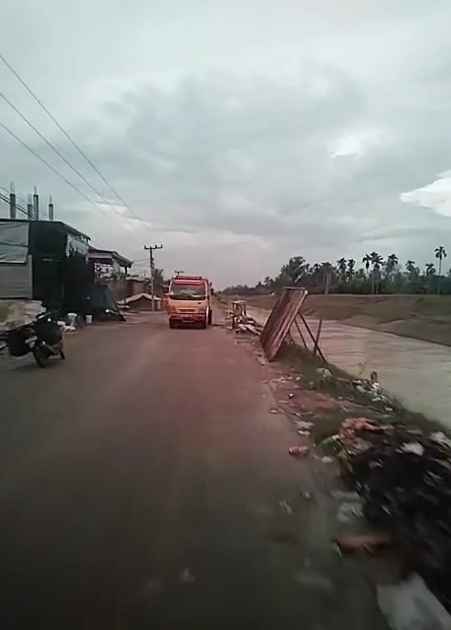 wet road in a somewhat rural area. On the left side of the road, there's a building under construction and a few parked motorcycles. On the right, a riverbank is cluttered with trash. A yellow and red truck approaches in the distance on the road, moving towards the camera. The sky is overcast with gray clouds. Power lines run above the road.