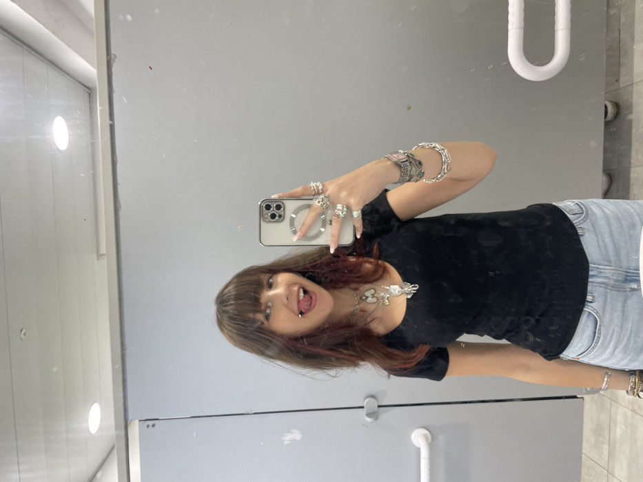 A young adult female is depicted in a mirror selfie within what appears to be a public restroom in Raanana, Israel