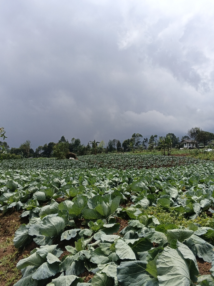 A vast field of mature cabbages stretches to the horizon under a cloudy sky
