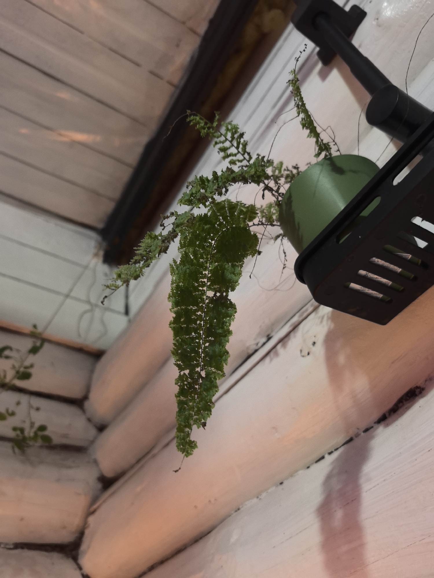 potted fern hanging on a wall constructed of light-colored logs. The pot is green and is held by a black, rectangular wall-mounted bracket. The fern has delicate, feathery fronds, some of which droop downwards. The image is taken from a low angle, looking up at the plant and wall. The location in Noviy, Russia is not determinable from the content of this picture.