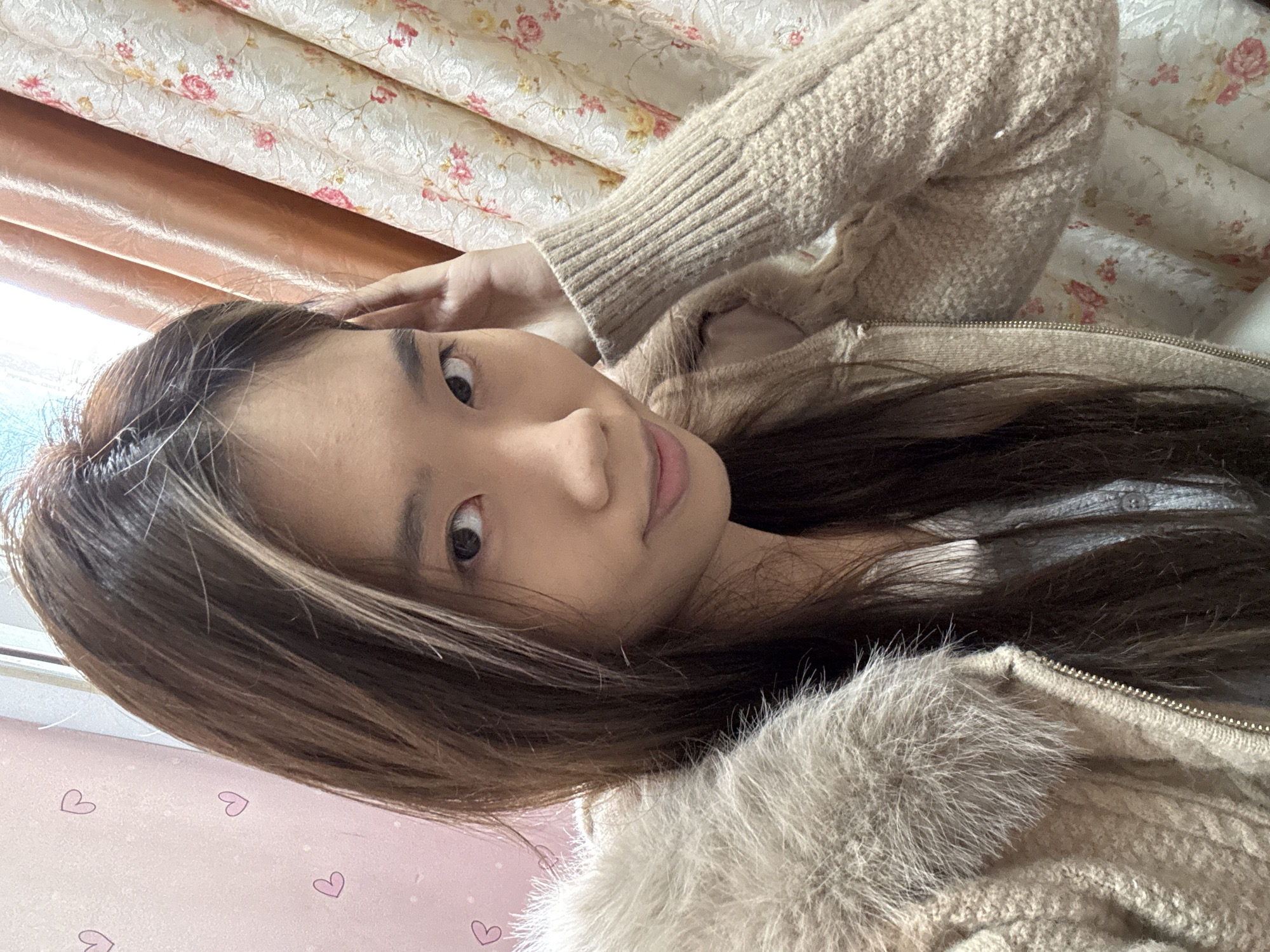 A young Asian woman is lying down indoors. She has long brown hair. She is wearing a light brown knitted sweater with a fur collar. A pink surface with heart drawings is visible near her head. A floral-patterned curtain is in the background. No additional information, including location in Shapingba District, China, is discernible from the image.
