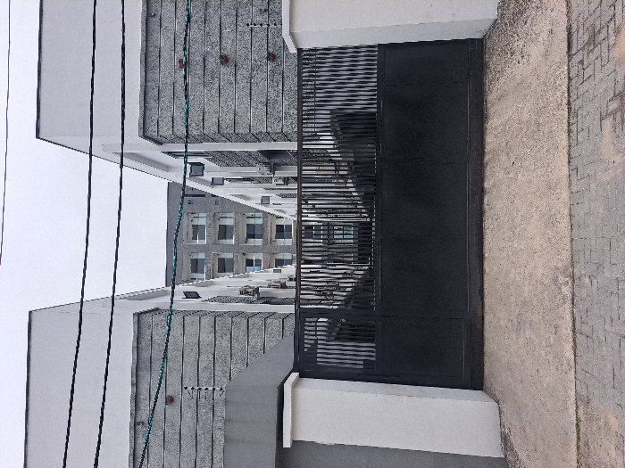 The image depicts the entrance to a modern residential or commercial complex in Moba, Nigeria, under an overcast sky. A closed, black metal gate with a solid lower section and vertical bars above serves as the primary barrier in the foreground, spanning the width of the entrance. This gate is flanked by two white-painted concrete pillars. Immediately behind the gate, a concrete driveway slopes upwards towards the interior of the property. The street in front of the gate is paved with grey interlocking bricks. Two identical, contemporary buildings flank the entrance, angled inwards. These structures feature a white upper facade and a textured grey, horizontally-paneled stone cladding covering their middle sections. Each building exhibits security features, including barbed or razor wire installed along the top of the grey cladding and small, red circular security sensors or alarm lights. Multiple outdoor air conditioning units are mounted on the internal walls of these flanking buildings. Overhead, black utility wires traverse the upper portion of the scene, with a green wire also visible on the right side. Centered between these two buildings, further in the background, stands a taller, multi-story building with a modern design, dark-framed windows, and visible balconies, appearing to be part of the same complex. No individuals or active events are present in the scene.