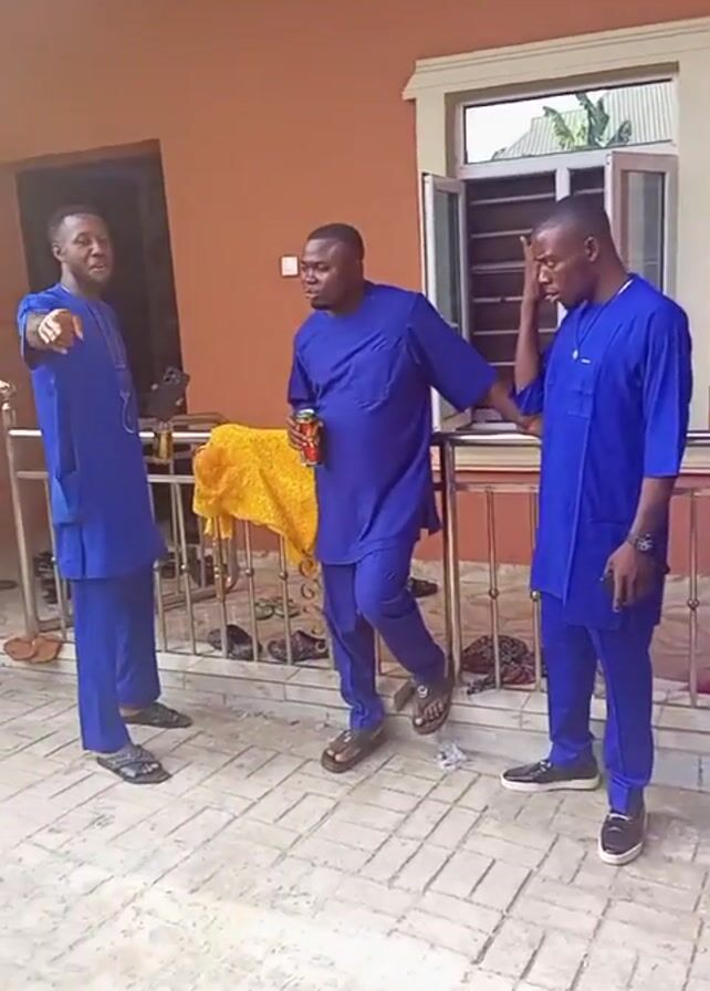 three men standing outside a house. They are all wearing matching blue outfits. One of the men is holding a can, and another is holding a cell phone to his ear. The third man is wearing a red and white hat. They appear to be in a festive mood and may be at an event or celebration. They are on a tiled patio in front of a salmon-colored building. Other people are present in the background.