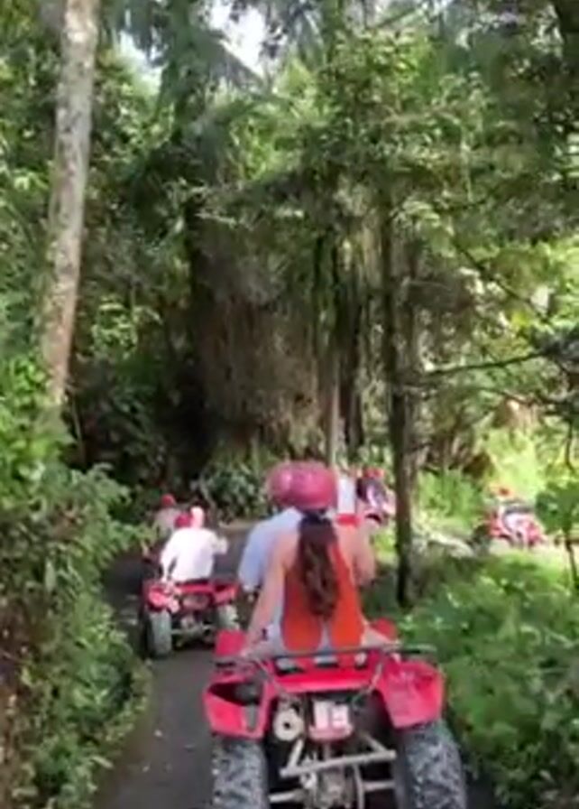 Several people are riding ATVs along a concrete path through a dense, green forest. The ATVs are red and each carries two people, all wearing helmets. The person in the back on the ATV closest to the camera is holding up a colorful drink. The path winds through the trees, and the camera follows the ATV riders as they move forward. The forest is lush with various trees and vegetation, creating a vivid natural setting.