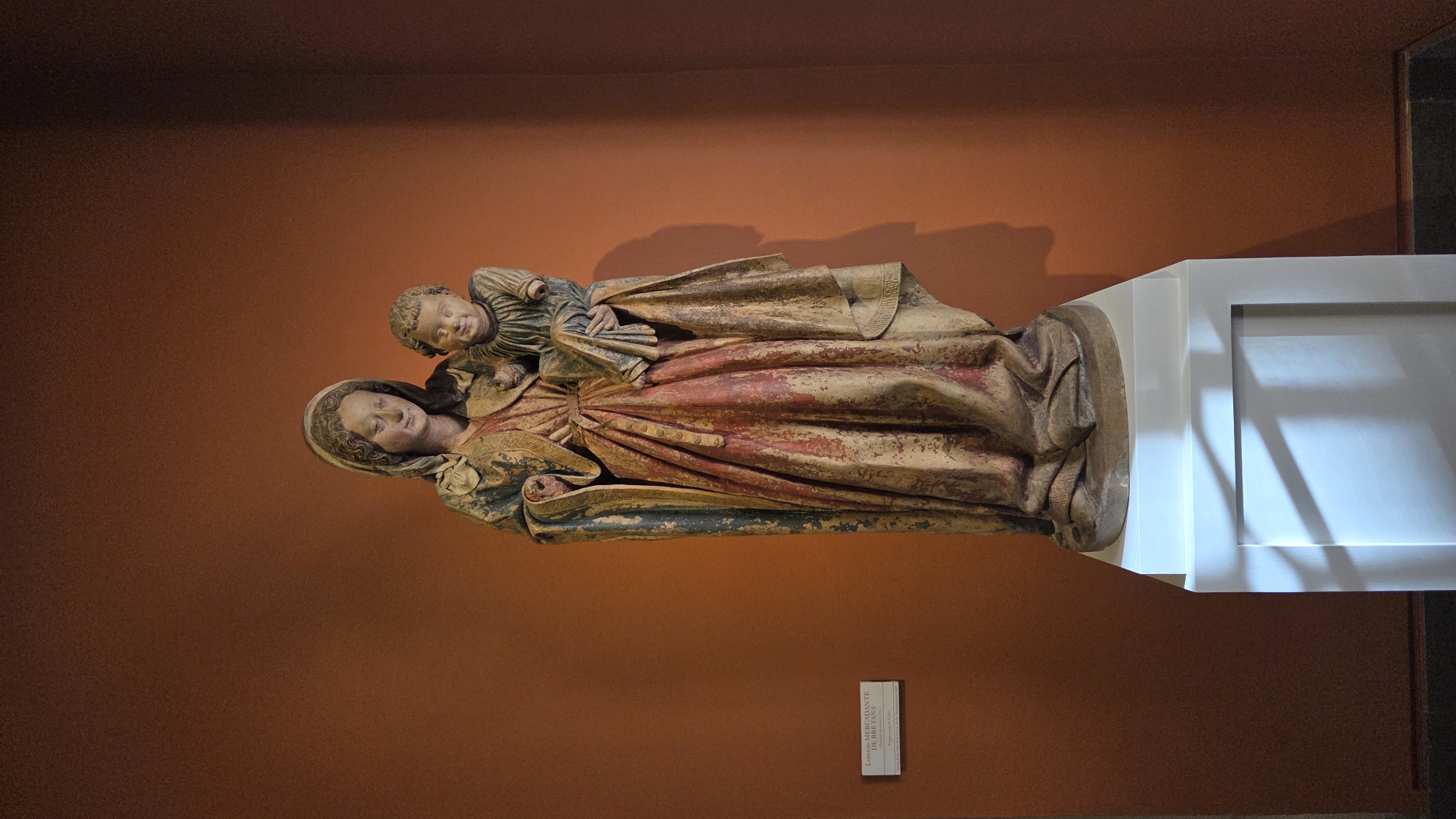 A polychrome wooden sculpture of the Virgin Mary holding the infant Jesus stands on a white rectangular pedestal against a plain reddish-brown wall