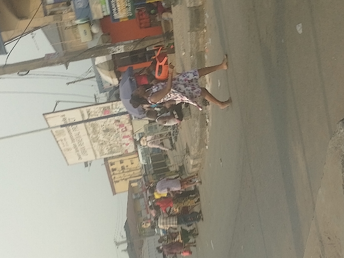 An urban street scene in Owerri, Nigeria, captured during daytime under a hazy sky