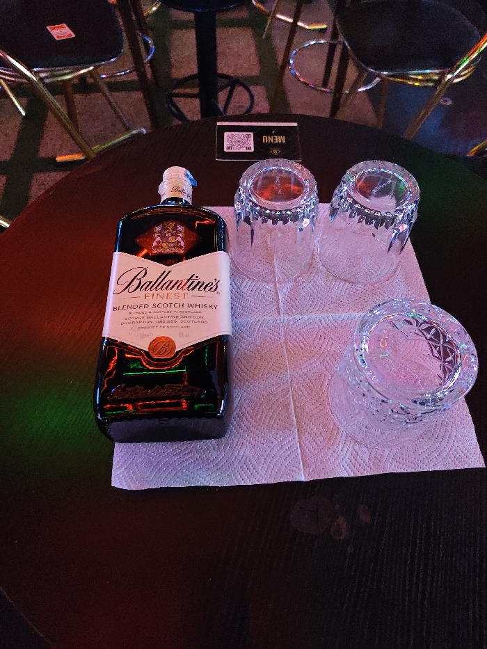 - "A bottle of Ballantine's Finest Blended Scotch Whisky sits on a black tabletop next to three empty, textured glasses arranged on a white paper napkin" by FM-Ys6e53, licensed under CC BY 4.0